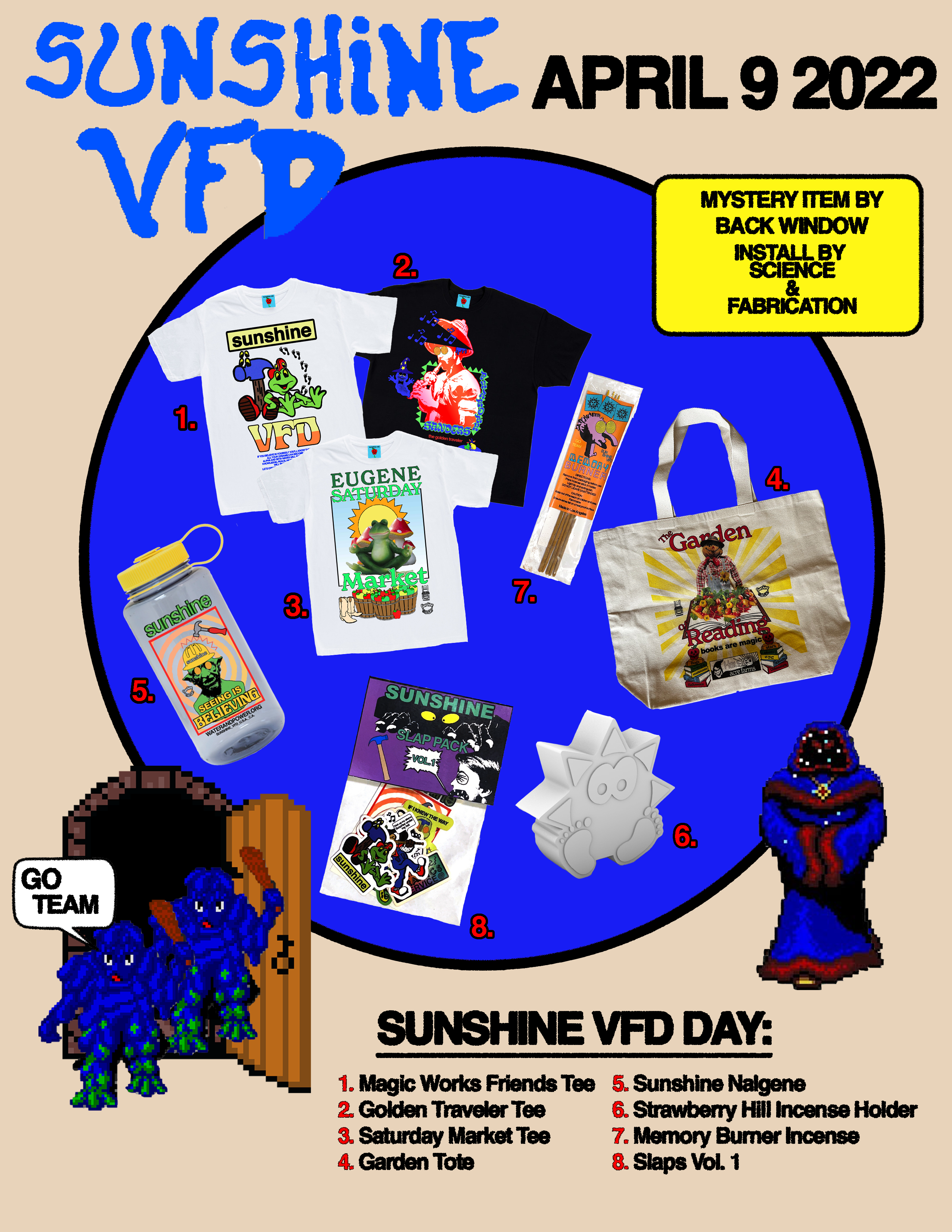 On April 9th of 2022 I held a pop-up shop for my creative outlet Sunshine VFD. I wanted the opportunity to try out some creative direction and experiment with a lifestyle entity. While I worked on the graphics for apparel, posters, stickers, and other various items, my talented team of friends (UO product design students) built the installation. Go Team!
